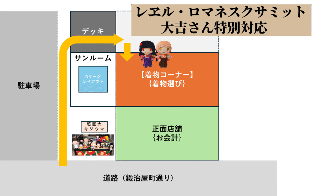 店舗横のキジウマが置かれているところを通って、デッキから着物コーナーに上がっていただき、こちらで着物を選べるようになります。